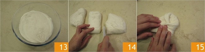 Nach der Gehzeit ist der Teig schön aufgegangen 13, also geben Sie ihn auf die Arbeitsfläche und teilen ihn mit einem Teigschaber in 3 Stücke à 265 g 14. Wenn nötig, können Sie die Arbeitsfläche leicht bemehlen. Nehmen Sie nun jede Portion und, wie zuvor, heben Sie einen Teigstreifen an und bringen ihn zur Mitte. Wiederholen Sie den gleichen Vorgang für die anderen 3 Teigstreifen 15.