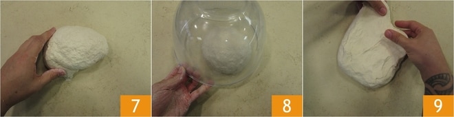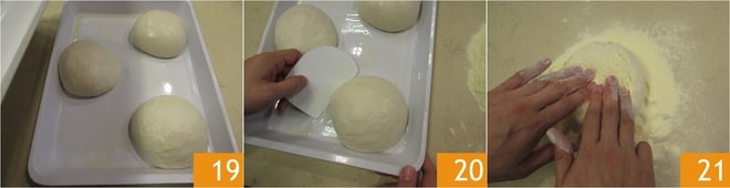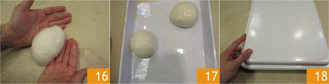 Drehen Sie den Teig um und führen Sie die Kugelbildung durch: Kugeln bedeutet, den Teig mit den Händen auf der Arbeitsfläche zu drehen, ihn zu sich zu ziehen und dann wiederholt wegzubewegen, bis Sie eine glatte und regelmäßige Kugel erhalten 17. Legen Sie die Teigkugeln nach und nach in eine zuvor eingefettete Pizzakiste 17 und decken Sie sie mit ihrem Deckel ab 18.