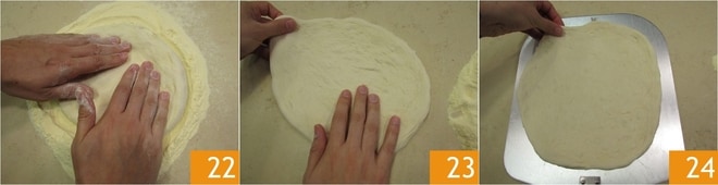 Fahren Sie auf diese Weise fort, indem Sie eine kreisende Bewegung ausführen, um den Teig zu erweitern 22. Drücken Sie niemals die Ränder und fahren Sie fort, bis Sie eine Scheibe mit einem Durchmesser von 28 cm haben 23. Übertragen Sie den Teig auf die Pizzaschaufel, ohne ihn zu beschädigen 24.