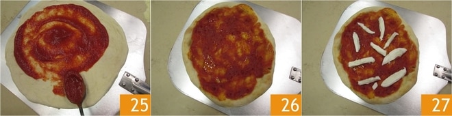 Nun verteilen Sie mit einem Löffel die Tomatensauce auf der Pizza, wobei Sie den Rand freilassen 25. Schieben Sie die Pizza vorsichtig auf den Pizzastein und lassen Sie sie etwa 6 Minuten backen. In der Zwischenzeit schneiden Sie den Mozzarella in Stäbchen 26 oder zupfen ihn mit den Händen. Sie können ihn vorsichtig ausdrücken, damit er bei der Zubereitung nicht zu viel Wasser abgibt 26. Nach 6 Minuten nehmen Sie die Pizza mit der Schaufel aus dem Ofen 27.