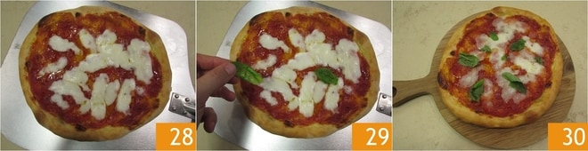 Legen Sie die Mozzarellastäbchen darauf 28 und backen Sie sie weitere 6 Minuten. Wenn die Pizza gut gebräunt ist, nehmen Sie sie aus dem Ofen, fügen Sie die Basilikumblätter hinzu 29 und, wenn Sie möchten, etwas Öl und servieren Sie sie. Backen Sie die anderen beiden Pizzen auf die gleiche Weise und genießen Sie Ihre einfache Margherita-Pizza schön heiß 30!