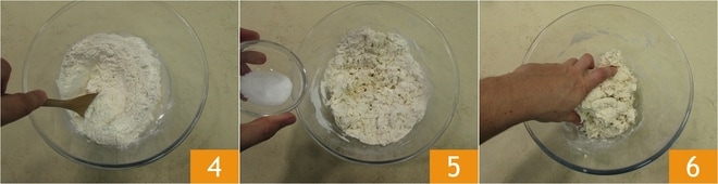 Rühren Sie nach und nach mit einem Holzlöffel um 4, und wenn Sie fast das gesamte Wasser hinzugefügt haben, fügen Sie auch das Salz hinzu 5. Gießen Sie weiter Wasser hinzu und beginnen Sie, mit den Händen zu kneten, um die Zutaten zu vermischen 6.