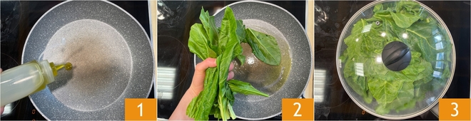 Für die Zubereitung der einfachen Pasqualina-Torte beginnt ihr mit dem Mangold: Erhitzt einen Schuss Öl in einer großen beschichteten Pfanne 1, gebt den Mangold dazu 2 und deckt die Pfanne mit einem Deckel ab 3.