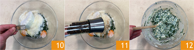 Würzt mit Muskatnuss 10, Salz und Pfeffer 11. Gut vermengen, bis eine homogene Masse entsteht 12. Beiseite stellen.
