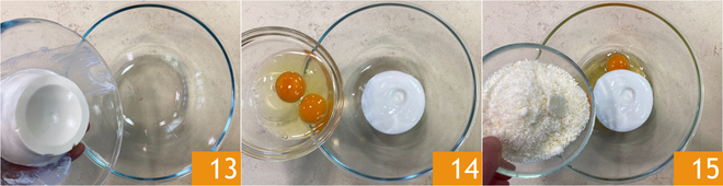 Weiter zur weißen Füllung: In einer anderen Schüssel Ricotta 13, Eier 14 und geriebenen Käse 15 geben.
