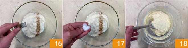 Fügt Muskatnuss 16, Salz 17 und Pfeffer hinzu und verrührt alles gut 18.