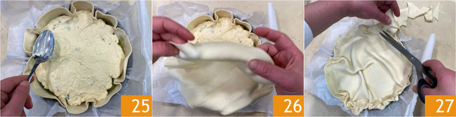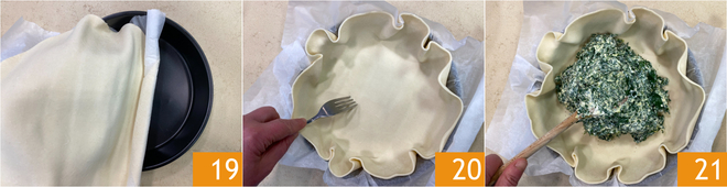 Jetzt seid ihr bereit, die Torte zu schichten: Rollt den Blätterteig aus und legt ihn samt Backpapier in eine Form mit 20 cm Durchmesser am Boden und 24 cm oben 19. Stecht den Boden mit einer Gabel ein 20, dann verteilt die grüne Füllung gleichmäßig 21.