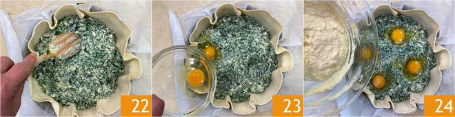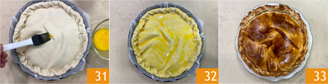 Bestreicht Oberfläche und Ränder der Torte mit der vorbereiteten Mischung 31. Im vorgeheizten Backofen (Ober-/Unterhitze) bei 200 °C etwa 50 Minuten backen. Sobald sie goldbraun ist, herausnehmen und etwas abkühlen lassen. Eure einfache Pasqualina-Torte ist servierbereit 33!