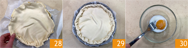 Verschließt die Ränder, indem ihr den Teig eindreht 28 29. In einer kleinen Schüssel Eigelb mit Milch verquirlen 30.