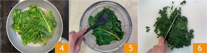 Bei mittlerer Hitze etwa 10–15 Minuten garen, bis er welk ist 4. Gebt den Mangold in ein Sieb und drückt ihn gut aus, um überschüssiges Wasser zu entfernen 5; so bleibt der Teig knusprig. Hackt ihn anschließend fein mit dem Messer 6.