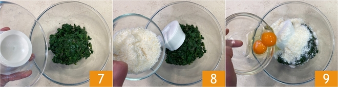 Für die grüne Füllung: Gebt den gehackten Mangold in eine Schüssel, dann fügt den Ricotta 7, den geriebenen Käse 8 und die Eier 9 hinzu.