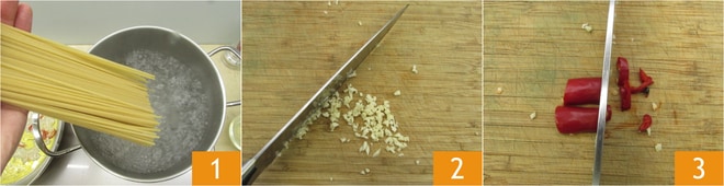 Um die einfachen Spaghetti aglio, olio e peperoncino zuzubereiten, stellen Sie zunächst einen Topf voller Wasser auf den Herd, salzen Sie es und geben Sie beim Kochen die Spaghetti hinein 1. Schälen und hacken Sie den Knoblauch und entfernen Sie den inneren Kern 2, hacken Sie auch den Peperoncino 3.