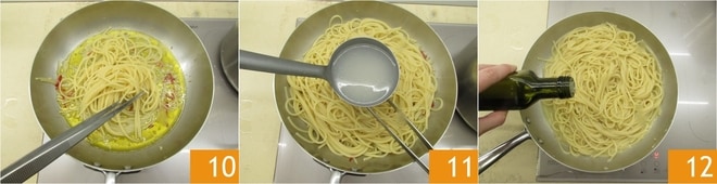 Wenn die Pasta al dente ist, geben Sie sie direkt in die Pfanne 10. Fügen Sie eine Kelle Kochwasser hinzu 11, lassen Sie es aufnehmen, um die Garzeit zu vervollständigen, und geben Sie dann etwa 40 g Öl hinzu 12. Schwenken Sie die Spaghetti kurz. Wenn das Mischen fast abgeschlossen ist, bei Bedarf mit feinem Salz abschmecken.