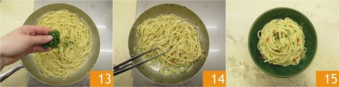 Würzen Sie mit der gehackten Petersilie 13, mischen Sie 14 und servieren Sie die Spaghetti aglio, olio e peperoncino gut warm 15.