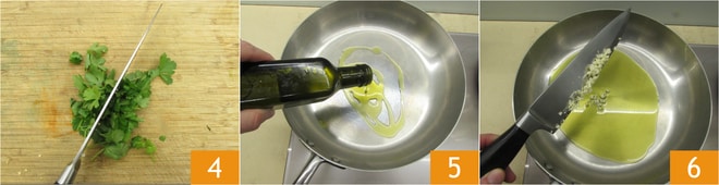 Zupfen Sie die Stiele der Petersilie ab und hacken Sie die Blätter 4. In der Zwischenzeit geben Sie in eine sehr breite Pfanne 20 g Öl 5 und den fein gehackten Knoblauch 6.