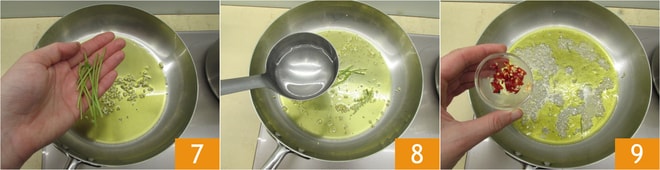 Fügen Sie auch die Petersilienstiele hinzu 7. Lassen Sie alles dünsten, indem Sie eine Kelle Kochwasser hinzufügen 8. Dann geben Sie den frisch gehackten Peperoncino hinzu 9 und lassen Sie es aromatisieren. Entfernen Sie dann die Petersilienstiele.