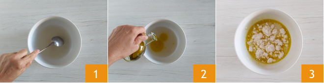 Um die einfache und schnelle Kartoffelfocaccia zuzubereiten, beginnen Sie mit dem Teig: Lösen Sie die Hefe in einer Schüssel mit Wasser auf 1, dann geben Sie das Öl hinzu 2 und mischen. Zum Schluss das Mehl hinzugeben und weiter mischen 3.