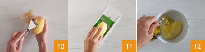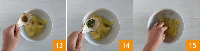 In der Zwischenzeit schälen Sie die Kartoffeln 10 und schneiden Sie sie mit Hilfe eines Mandolinschneiders oder eines Messers in dünne Scheiben 11. Legen Sie die Scheiben in eine Schüssel und würzen Sie sie mit 15 g Olivenöl 12.