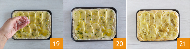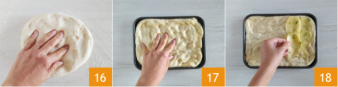 Nach der Gehzeit den Teig schnell auf der bemehlten Arbeitsfläche verarbeiten und mit den Fingerspitzen flachdrücken 16. Legen Sie ihn in eine geölte Form von 25 x 20 cm und drücken Sie ihn bis zu einer Dicke von etwa einem halben Zentimeter, indem Sie 5 g Olivenöl auf der Oberfläche verteilen 17. Verteilen Sie die Kartoffelscheiben auf der Oberfläche, indem Sie sie leicht überlappen 18.