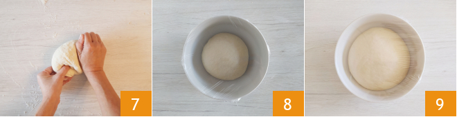 Arbeiten Sie weiter, bis Sie einen homogenen Teig erhalten 7. Legen Sie den Ball in eine Schüssel, decken Sie ihn mit Folie ab 8 und lassen Sie ihn 45 Minuten ruhen oder bis zur Verdopplung des Volumens unter einer Wolldecke 9.