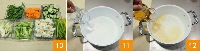 Wenn Sie alle Gemüse gereinigt und geschnitten haben 10, stellen Sie einen großen Topf mit Wasser 11 und Essig 12 auf die Hitze.