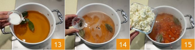 Fügen Sie die Lorbeerblätter, Salz, Zucker 13 und schwarzen Pfeffer und Wacholderbeeren 14 hinzu. Wenn das Wasser beinahe den Siedepunkt erreicht hat, geben Sie die Karotten und den Blumenkohl dazu 15 und lassen Sie sie 3 Minuten bei mittlerer Hitze kochen.