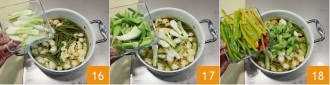 Geben Sie dann die grünen Bohnen, die Frühlingszwiebeln 16, den Sellerie 17 und die Paprika 18 dazu, die Sie geschnitten haben.