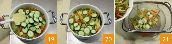 Beenden Sie mit den Gurken 19 und lassen Sie alles weitere 4 Minuten kochen. Sobald das Gemüse fertig ist 20, nehmen Sie den Topf vom Herd und lassen Sie es gut abtropfen, wobei Sie die Kochflüssigkeit in einer Schüssel aufbewahren 21.