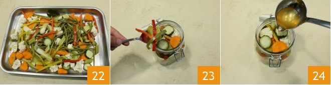 Lassen Sie das Gemüse in einer Edelstahlschale abkühlen 22 und gehen Sie währenddessen zur Sterilisation der Gläser und Deckel über, wie in den Richtlinien des Gesundheitsministeriums am Ende des Rezepts angegeben. Sobald das Gemüse vollständig abgekühlt ist, legen Sie es in das Glas 23, indem Sie versuchen, es ordentlich anzuordnen, jedoch ohne es zu sehr zu pressen. Filtern Sie dann die Kochflüssigkeit, die Sie beiseite gehalten haben, und gießen Sie sie in die Gläser ein, wobei Sie darauf achten, 1 Zentimeter unter dem Rand des Glases anzuhalten 24. Schließen Sie die Gläser. Wenn Sie Gläser mit Schraubverschluss verwenden, schrauben Sie die Deckel gut zu, jedoch ohne sie zu fest anzuziehen. Gehen Sie dann zur Pasteurisierung der Gläser über, indem Sie die Anweisungen in den Richtlinien des Gesundheitsministeriums am Ende des Rezepts befolgen. Wenn Sie Gläser mit Schraubverschlüssen verwenden, überprüfen Sie nach dem Abkühlen der Gläser, ob das Vakuum korrekt ist: Drücken Sie in die Mitte des Deckels, und wenn Sie das typische "Klick-Klack" nicht hören, ist das Vakuum korrekt. Wenn Sie nach dem erneuten Kochen die Bildung kleiner Luftblasen bemerken, klopfen Sie das Glas, wenn es noch warm ist, vorsichtig auf eine Fläche, damit die Blasen an die Oberfläche steigen und dann von selbst verschwinden. Wenn Sie Gläser mit Gummidichtungen verwenden, können Sie beim Verzehr der Giardiniera den Vakuumtest machen, indem Sie an der Lasche ziehen: Wenn beim Ziehen ein trockenes Geräusch zu hören ist, bedeutet das, dass der Inhalt korrekt unter Vakuum aufbewahrt wurde. Wenn beim Ziehen die Dichtung "weich" ist, bedeutet das, dass das Vakuum nicht korrekt gebildet wurde, und es ist besser, den Inhalt nicht zu essen. Ihre eingelegte Giardiniera ist bereit, genossen zu werden!