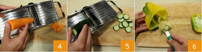 Schälen Sie die Karotten mit einem Sparschäler und schneiden Sie sie dann mit einem gewellten Messer 4 zusammen mit den Gurken 5 in Scheiben von 0,5 cm Dicke. Schneiden Sie alle Paprikaschoten und entfernen Sie mit einem Messer die Samen im Inneren 6.