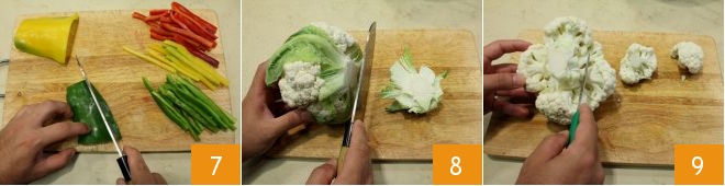 Reduzieren Sie die Paprika in nicht zu dünne Streifen 7 und gehen Sie dann zum Blumenkohl über. Entfernen Sie mit einem kleinen Messer die äußeren Blätter, schneiden Sie den Strunk ab 8 und trennen Sie die Röschen ab, indem Sie an der Verbindung mit dem Hauptstamm einschneiden 9.