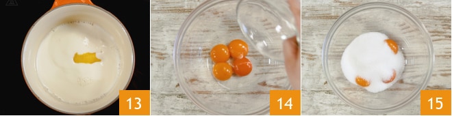 In der Zwischenzeit bereitet die Zitronencreme vor: Gebt die Milch in einen kleinen Topf, fügt die Zitronenschale und die Vanillin hinzu und bringt sie zum Sieden 13. Gebt in der Zwischenzeit die Eigelbe in eine separate Schüssel 14 und fügt den Zucker hinzu 15.