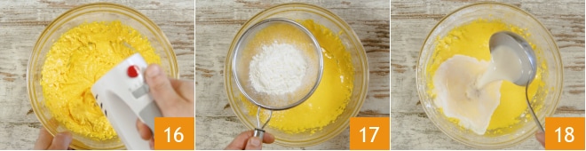 Schlagt die Eigelbe mit einem elektrischen Mixer, bis eine helle und schaumige Masse entsteht 16, dann siebt die Maisstärke in die Schüssel 17 und arbeitet weiter, um sie gleichmäßig einzubinden. Entfernt die Zitronenschale aus dem kleinen Topf, dann fügt eine Kelle heiße Milch zur Eigelbmischung hinzu 18, gut umrühren, um sie zu temperieren.