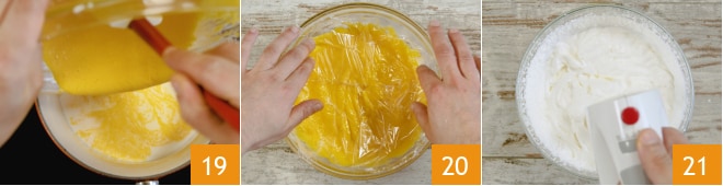 Gebt die erhaltene Mischung in den kleinen Topf zusammen mit der restlichen Milch 19 und rührt ständig bei niedriger Hitze, bis die gewünschte Konsistenz erreicht ist. Wenn die Creme eingedickt ist, übertragt sie in eine Schüssel und bedeckt sie mit Frischhaltefolie im Kontakt 20. In der Zwischenzeit schlagt die Sahne für die Dekoration 21.
