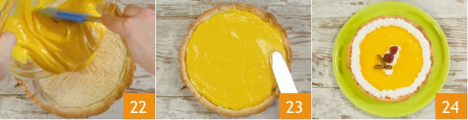 Zu diesem Zeitpunkt wird der Boden gebacken sein, also aus dem Ofen nehmen und abkühlen lassen. Wenn beide Zubereitungen Raumtemperatur erreicht haben, gebt die Creme in die Mürbeteigschale 22 und glättet die Oberfläche mit dem Spatel 23. Dekoriert mit der aufgeschlagenen Sahne, knusprigen Keksen (nach Belieben) und Himbeeren oder anderen Früchten nach Belieben: Eure Eiweiß-Tarte mit Zitronencreme ist bereit, um genossen zu werden 24!