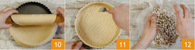 Wickelt den Mürbeteig um das Nudelholz und rollt ihn vorsichtig auf eine Form mit einem Durchmesser von 18 cm (ein Einfetten ist nicht nötig) aus 10, dann drückt mit den Fingern, um ihn auch an den Rändern anzupassen. Stecht den Boden mit den Zinken einer Gabel ein, deckt ihn mit einem Blatt Backpapier ab und füllt die Form mit getrockneten Hülsenfrüchten oder Keramikkugeln 12. Führt das Blindbacken durch, indem ihr den Boden 15 Minuten lang im vorgeheizten statischen Ofen bei 180° backt, dann entfernt die Gewichte und das Backpapier und backt weitere 15 Minuten bei der gleichen Temperatur.