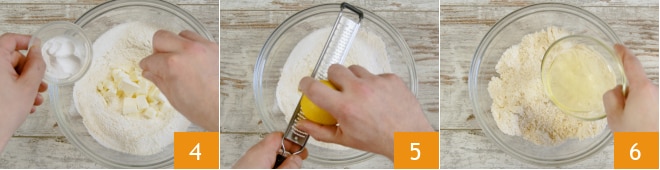 Gebt auch das Natron 4 und die geriebene Zitronenschale 5 hinzu. Beginnt mit den Fingern zu arbeiten, bis eine krümelige Mischung entsteht, dann fügt die Eiweiße bei Zimmertemperatur hinzu 6.