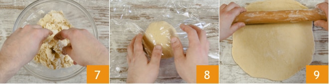 Knetet weiter, um alle Zutaten zu verbinden 7, dann gebt die Mischung auf die Arbeitsfläche und formt einen glatten und homogenen Teig. Wickelt den Teig in Frischhaltefolie 8 und lasst ihn etwa 30 Minuten im Kühlschrank ruhen. Nach der Ruhezeit rollt den Mürbeteig auf einer leicht bemehlten Arbeitsfläche auf eine Dicke von 4-5 mm aus 9.