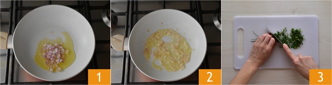 Um das Eiweißomelett zuzubereiten, schälen und hacken Sie die Zwiebel und geben Sie sie dann mit einem Schuss Öl in eine Pfanne 1. Rösten Sie sie bei mäßiger Hitze einige Minuten lang, wobei Sie gelegentlich umrühren, bis sie weich ist 2. Lassen Sie die geröstete Zwiebel abkühlen. Hacken Sie die Kräuter 3.