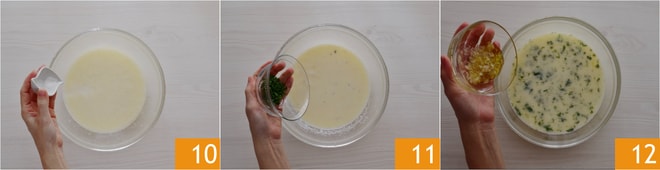 Salzen Sie 10 und fügen Sie die gehackten Kräuter hinzu 11. In der Zwischenzeit sind die Zwiebeln abgekühlt, fügen Sie sie den Eiweißen hinzu 12.
