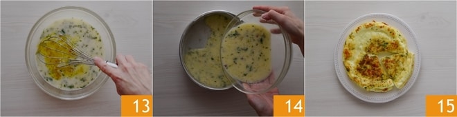 Rühren Sie sorgfältig um 13 und geben Sie die Mischung in eine runde Form von 18-20 cm, die mit Backpapier ausgelegt ist (je nachdem, welche Höhe Sie dem Omelett geben möchten) 14. Backen Sie es im vorgeheizten statischen Ofen bei 180° für 25 Minuten. Sobald es fertig ist, lassen Sie es abkühlen, bevor Sie es stürzen 15. Das Eiweißomelett ist bereit zum Genießen.