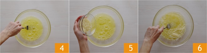 Geben Sie die Eiweiße in eine Schüssel 4, fügen Sie den geriebenen Parmigiano Reggiano DOP und den Pecorino hinzu 5. Alles vermischen 6.