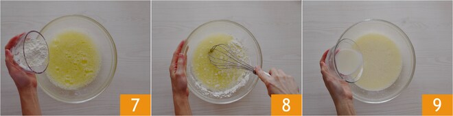 Fügen Sie auch die Kartoffelstärke hinzu 7 und rühren Sie um, bis sie aufgesogen ist 8, dann geben Sie die Milch hinzu 9.
