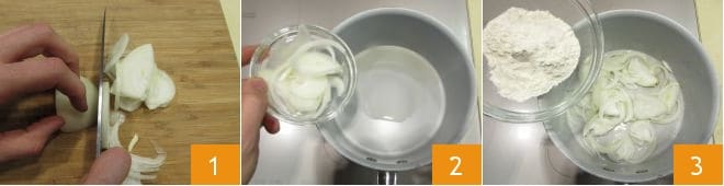 Um die Enchilada-Sauce zuzubereiten, schält die weiße Zwiebel und schneidet sie in Scheiben 1, erhitzt in einem Topf das Pflanzenöl (15 g) und fügt dann die Zwiebelscheiben hinzu 2, gebt auch das gesiebte Mehl dazu 3,