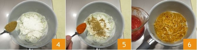 den Kreuzkümmel 4 und das Chilipulver 5, lasst es 3-4 Minuten anbraten, dann gebt die geschälten Tomaten hinzu 6