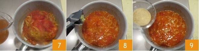 verdünnt es mit Wasser 7, der Einfachheit halber könnt ihr denselben Krug verwenden, den ihr für die Tomaten benutzt habt. Aromatisiert mit zerdrücktem Knoblauch, indem ihr euch mit einer Knoblauchpresse helft 8 und fügt dann auch den braunen Zucker hinzu 9
