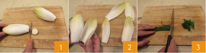Um die Endivien-Schiffchen mit Käse zuzubereiten, beginnen Sie mit der Reinigung des Gemüses. Waschen Sie das Gemüse und trocknen Sie es gut mit einem sauberen Tuch. Entfernen Sie dann den Strunk der Endivie 1. Blättern Sie es vorsichtig auf, um 12 Blätter zu erhalten 2, achten Sie darauf, sie nicht zu zerbrechen. Legen Sie sie beiseite. Fahren Sie dann fort, den Schnittlauch fein zu hacken 3.