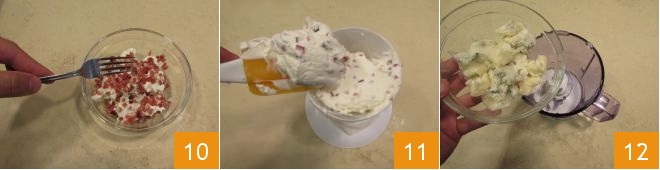 In die andere Schüssel mit Robiola fügen Sie den Speck hinzu 10, achten Sie darauf, einige Speckwürfel für die Dekoration zurückzuhalten. Mischen Sie ihn gut mit dem Robiola und geben Sie ihn in einen zweiten Spritzbeutel mit Sterntülle 11, den Sie ebenfalls beiseite legen. Fahren Sie mit der Zubereitung der dritten Creme fort: Mixen Sie den Gorgonzola in einem Mixer 12.