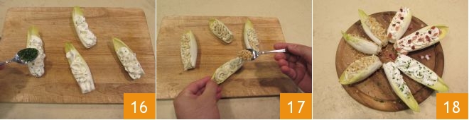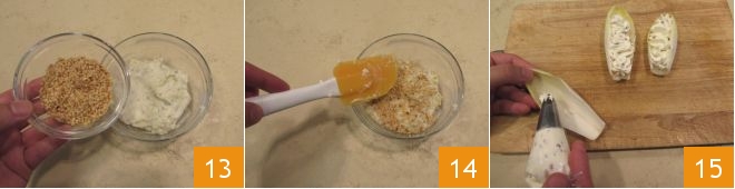 Wenn Sie eine homogene Creme erhalten haben, geben Sie sie in eine Schüssel und fügen Sie die gehackten Walnusskerne hinzu 13. Behalten Sie einige Walnüsse für die finale Dekoration zurück. Mischen Sie die Zutaten mit einem Spatel 14 und geben Sie auch diese Creme in einen Spritzbeutel mit Sterntülle. Zu diesem Zeitpunkt sind die Cremes fertig und Sie können mit dem Füllen der Endivienblätter fortfahren. Nehmen Sie ein Endivienblatt und den ersten Spritzbeutel mit der Creme aus Ziegenkäse und Schnittlauch. Füllen Sie die Vertiefung des Blattes 15.