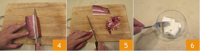 Schneiden Sie dann die Schwarte vom Speck 4, anschließend in sehr dünne Streifen und dann in Würfelchen 5. Bereiten Sie dann die verschiedenen Käsefüllungen vor: Geben Sie den Robiola und den Ziegenkäse in eine Schüssel und zerkleinern Sie die Käse mit einer Gabel 6.
